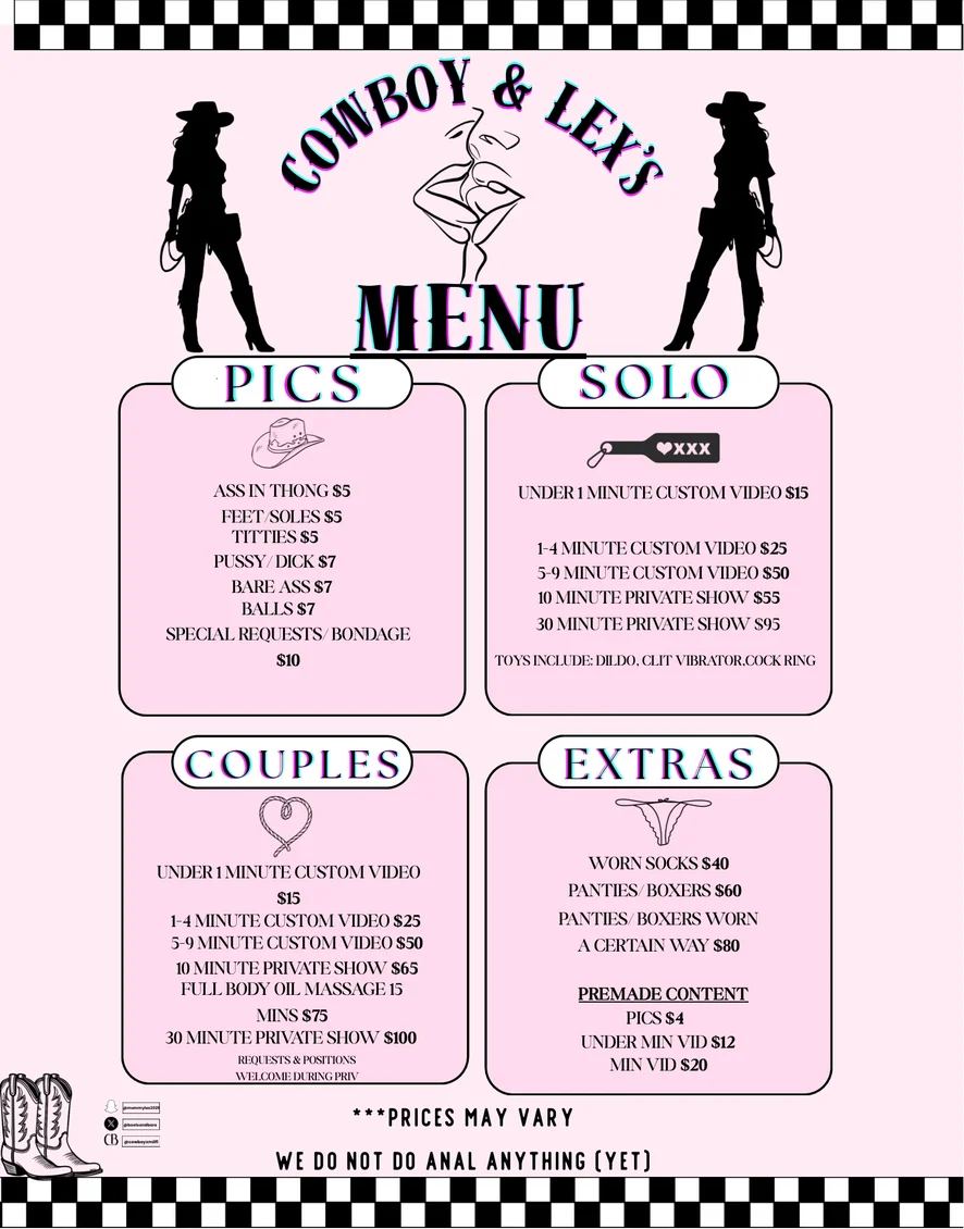 Szopás, Lovaglás, Élvezés, Dildó vagy vibrátor, Kutyapóz, Ejakuláció, Arc, Ujjazás, Villantás, Flexing, Kézimunka, Magassarkú, Megalázás, Csókolózás, Masszás, Felszarvazott, Lábfétis, Bőr, Maszturbálás, Olajozás, Orgazmus, Dörzsölés, Zuhany, Félmeztelen, Twerk